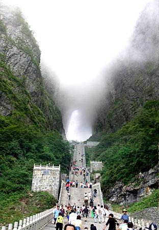 選擇乘索道游覽天門山是最佳視角。索道吊廂一出站房,馬上就騰空飛了起來,從城市的一棟棟樓頂掠過,猶如在城市上空滑翔。翻過一道山梁之后,城市被遠(yuǎn)遠(yuǎn)拋在了視線以外,大片翠綠的稻田映入眼簾,透過打開的通風(fēng)窗口,一陣陣青草水田特有的清香沁入心脾;蚋呋虻偷霓r(nóng)舍不時(shí)從我們身下滑過,牛羊們?nèi)齼蓛捎崎e的在田間浮動著,靜謐、安詳。再翻過一座山峰,我們便立即被滿山的青翠所包圍,萬仞絕壁也已投懷送抱。索道支架矗立于絕壁天險(xiǎn)中,或挺立或傾倒或探頭或擁抱,我們繼續(xù)在艱險(xiǎn)中游歷,時(shí)而隱沒于云堆,時(shí)而出世于蒼穹。這時(shí)你除了那滿懷的驚險(xiǎn)刺激外有的便只有望索而興嘆了。我拍了很多片子,但是總覺得還是沒有足以記錄下來這座空中盆景的壯麗。