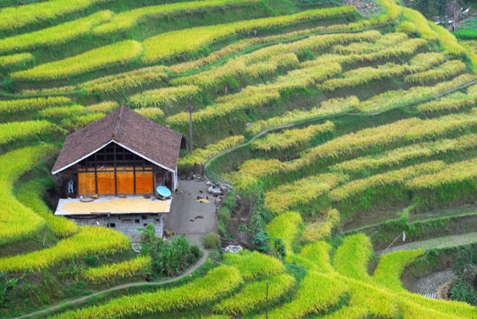 紫鵲界梯田位于湖南新化縣西部山區(qū)水車鎮(zhèn),她周邊的梯田達(dá)8萬(wàn)余畝以上,其地勢(shì)之高,規(guī)模之大,形態(tài)之美,堪稱世界之最。 紫鵲界生態(tài)環(huán)境優(yōu)美,梯田密集,形態(tài)原始,阡陌縱橫,線條流暢,山高水長(zhǎng),板屋交錯(cuò),充分展示出梯田的自然美、古樸美、形體美、文化美。尤其是隨著四季氣候的變化,使紫鵲界梯田更加婀娜多姿,如臨人間仙境。水奉公路盤旋于這些梯田之間達(dá)十余公里,梯田遍布于海撥500米至1000余米的十幾個(gè)山頭上,最大的不過1畝,最小的只能插幾十蔸禾,連綿起伏,輾轉(zhuǎn)盤旋,可謂是儀態(tài)萬(wàn)方,令人贊嘆不已。
