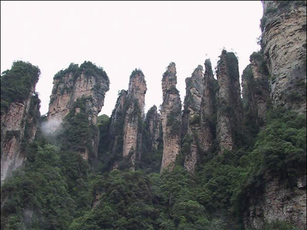 從仙人橋去老屋場(chǎng),但見深谷里密密麻麻羅列上百座石峰,活像一群威武雄壯的將士列隊(duì)聽令,相傳這是向王天子的神兵在聚會(huì)。神話雖不可靠,但石峰如此集中壯觀,在武陵源也屬罕見。我想引用一位美術(shù)大師的話:“豈有此理,莫名其妙,說也不信,到此方知”。不看神兵聚會(huì),怎知石峰成林。