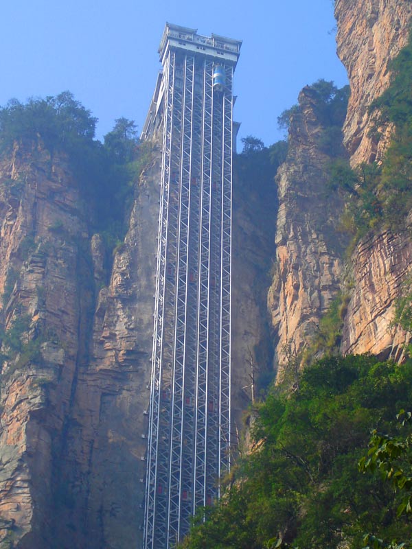 百龍?zhí)焯,垂直高?35米,運行高度326米,由154米山體內堅井和172米貼山鋼結構井架等組成,采用三臺雙層全暴露觀光電梯并列分體運行,每臺次載客50人次,運行速度3米/秒,三臺同時運行每小時往返量達4000人次。百龍?zhí)焯莸男藿▽崿F(xiàn)“山上游,山下住”的目標,提供了交通保障,將袁家界天下第一橋、迷魂臺、天懸白練以及烏龍寨、楊家界等絕世美景從幕后推向了前臺,并將天子山、袁家界、金鞭溪等精品旅游線路連為一體,解決了多年困擾景區(qū)的交通瓶頸問題。