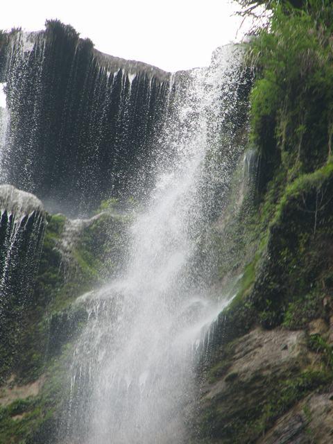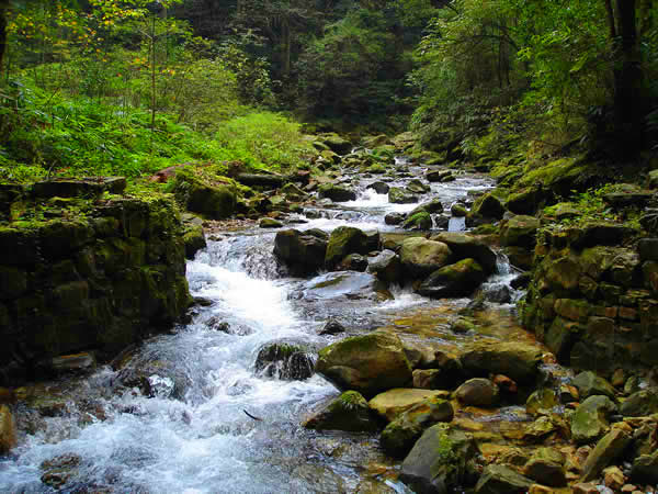杉刀溝盡頭,有一抹泉水從200多米高的崖頂飄然而下,仿佛一匹白色長練自天而降。飛瀑下臨深潭,綠水泱泱,水霧漫漫,睛雨交加之日,時有彩虹飛升。每當山洪瀑發(fā),瀑布猶如一巨龍,飛騰傾瀉,聲若巨雷,蔚為壯觀。