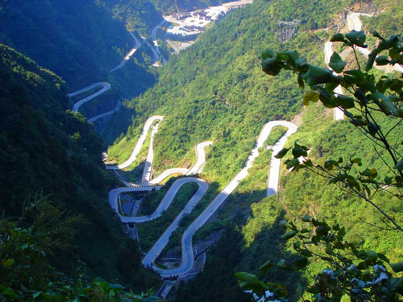 | 張家界天門山盤山公路有"通天大道"之稱,盤山公路全長10.77公里,海拔從200米急劇提升到1300米,大道兩側(cè)絕壁千仞,空谷幽深,共計99個彎,180度急彎此消彼長,似玉帶環(huán)繞,彎彎緊連,層層迭起,被譽為“天下第一公路奇觀”。