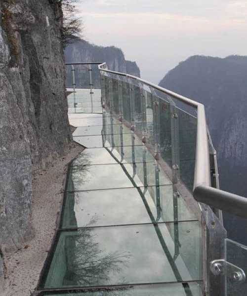 2011年10月1日,張家界天門山國(guó)家森林公園新建的玻璃棧道正式對(duì)游客開放。玻璃棧道懸于天門山頂西線,長(zhǎng)60米,最高處海拔1430米。是張家界天門山景區(qū)繼懸于峭壁之上的鬼谷棧道、憑空伸出的玻璃眺望臺(tái)、從玻璃臺(tái)可以看見下面。玻璃臺(tái)伸出棧道有4-5米,專供游人拍照、橫跨峽谷的木質(zhì)吊橋后打造的又一試膽力作。為了讓游客零瑕疵的透過玻璃橋看到美麗的風(fēng)景,上橋的游客均要求戴上鞋套,以保持玻璃橋的透明和干凈。玻璃棧道的刺激震撼,可與舉世聞名的美國(guó)大峽谷玻璃走廊“天空之路”媲美,因而有了東方“天空之路”的美譽(yù)。