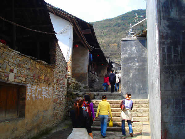 苦竹寨 賀龍?jiān)谏V哺锩鼤r(shí)期,幾乎踏遍了澧水兩岸的山山水水,村村寨寨。苦竹寨是澧水邊的一座少數(shù)民族雜居的村落,保留了明清時(shí)的建筑特色,民風(fēng)淳樸,村民能歌善舞,許多桑植民歌都是靠苦竹寨的歌手流傳的。入夜的時(shí)候,苦竹寨亮起了盞盞紅燈,這是村里的一個(gè)傳統(tǒng)。當(dāng)年紅軍夜行軍過(guò)苦竹寨的時(shí)候,村里有個(gè)老婆婆怕紅軍夜黑路難走,便在家門口懸起了一盞紅燈,其它村民爭(zhēng)相效仿,苦竹寨成了一個(gè)燈的世界。這段軍民魚水情被寫成了歌,傳唱到現(xiàn)在,這就是《門前掛盞燈》。