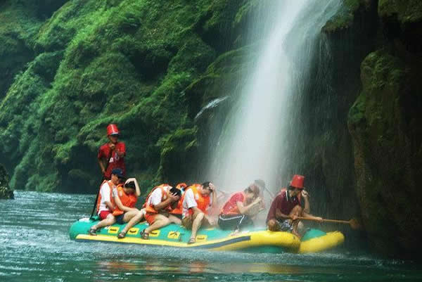 茅巖河漂流 茅巖河沿途的眾多飛瀑流泉中,尤以水洞瀑布最為壯觀迷人。瀑布從70多米高的峭壁瀉出,漫流過三級凸凹不平的峭壁,形成長短不一的三疊,瀑水在每級的石臺上漫過突兀出來的溝溝槽槽飛流而下,或?qū)捜玢y河,或窄似白練,或似垂掛的水簾,或似串串銀珠,飛落茅巖河中,撞擊得河水顫顫悠悠,鱗光閃閃。