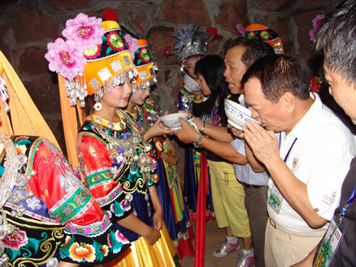 祝賀詞和答謝詞之后,主人把早已想好了的農(nóng)事或家事其日常生活的要事向來(lái)客提問(wèn),接謝人隨問(wèn)隨答,然后由族長(zhǎng)十分恭敬地雙手舉起盛滿包谷酒的酒杯,遞給一個(gè)年長(zhǎng)客人,一碗一碗地讓客人們喝下這香醇美的包谷燒酒。一切儀式做完之后,說(shuō)聲:“得罪了,最尊貴的客人”,客人答一聲“請(qǐng)不要客氣,我們都是一家人”。這時(shí),酒門(mén)大開(kāi),攔門(mén)人很禮貌地讓開(kāi)一條道路恭迎客人進(jìn)屋。