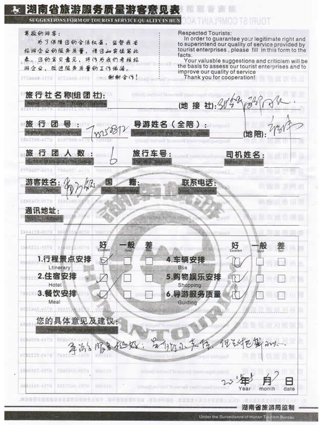 8月初,山西太原孟先生一行6位貴賓與湖南西部(張家界)中國國際旅行社工作人員——小吳取得聯(lián)系,經(jīng)過商談,雙方達成協(xié)議并簽訂旅游合同,于8月14日抵達張家界,開始張家界之旅。此次行程是由我社優(yōu)秀導(dǎo)游——褚偉負(fù)責(zé)旅游接待工作,褚導(dǎo)在旅游過程中講解詳細(xì),客人也很滿意,在意見表上寫道:導(dǎo)游服務(wù)挺好,謝謝周先生。同時也感謝周先生選擇湖南西部(張家界)中國國際旅行社,以及您對湖南西部國旅的信任與支持。我們會繼續(xù)努力,做好旅游接待工作。期待下一次與您的合作,祝您愉快!