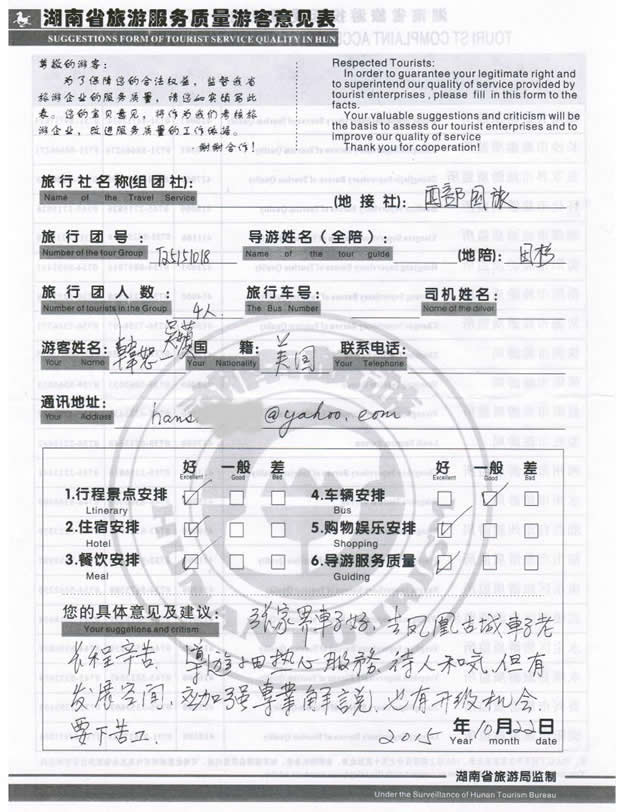 現(xiàn)在位置:首頁(yè) -> 西部國(guó)旅->旅游質(zhì)量反饋 -> 2015-10-18 臺(tái)灣韓先生一行4位貴賓 天門山、張家界、天子山、鳳凰古城四日游