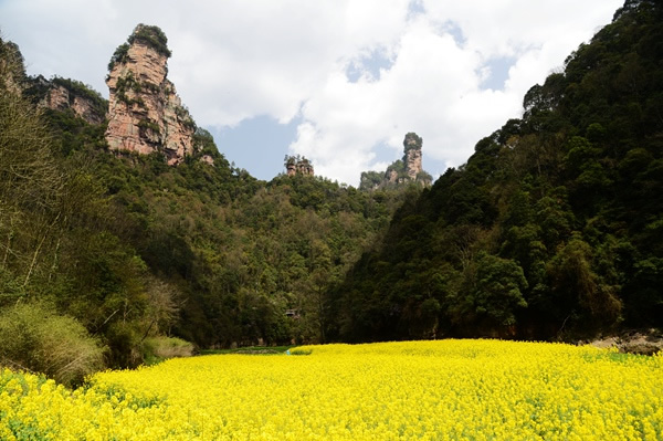 據(jù)了解,這塊“黃金地”位于武陵源十里畫廊景點入口靠近索溪湖尾處,實乃一片沙洲地,景區(qū)居民種植的油菜正是花開季節(jié),猶如黃金灑滿大地。這塊色澤艷麗的“黃金地”,與近處清澈的溪水、嫩綠的水草,以及遠處發(fā)芽的樹木、翠微的峰林一起,構(gòu)成一幅絕美天然的山水畫,為外界傳遞著武陵源濃濃的春意。