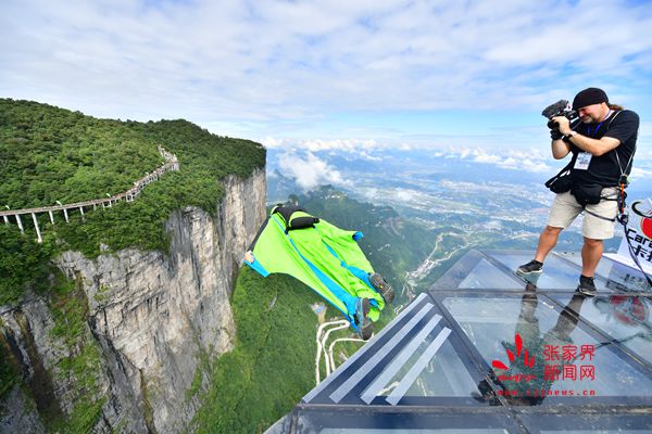 2017世界翼裝飛行世錦賽將于9月8日-10日在張家界天門山舉辦。開賽在即,9月7日上午,來(lái)自全球11個(gè)國(guó)家的16名翼裝飛行員從海撥1458米的張家界天門山玉壺峰頂一躍而下,在奇峰險(xiǎn)壑間進(jìn)行競(jìng)速訓(xùn)練。