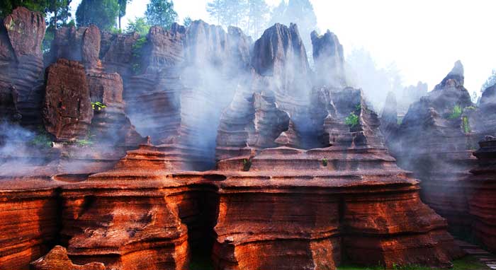 走進(jìn)古丈紅石林國(guó)家地質(zhì)公園,就如同走進(jìn)了一個(gè)夢(mèng)幻般的世界,成柱成片的紅色石林、石崖、石墻、石峰,分布在群山峻嶺之中。石林造型千姿百態(tài),有的象總統(tǒng)頭像,巨人屹立,有的如神龜探海,鷹擊長(zhǎng)空;有的像紫荊花怒放,海洋冰床,有的像城堡峰塔,大廈高樓,有的如樓蘭古城、駝鈴聲聲,有的像乳燕待哺、蝸牛搬家、有的如七彩迷宮、利劍刺空;有的像航母巡游、石兵列陣;有的如少女出浴、觀音坐蓮;有的像石鞭候主、靈龜探海;有的如棕熊迎客、天狗吠日;有的如水獺望云、母雞搗窩……尤以“大地劇場(chǎng)”、“巨人園”、“古城故宮”為奇石絕景中的最佳。